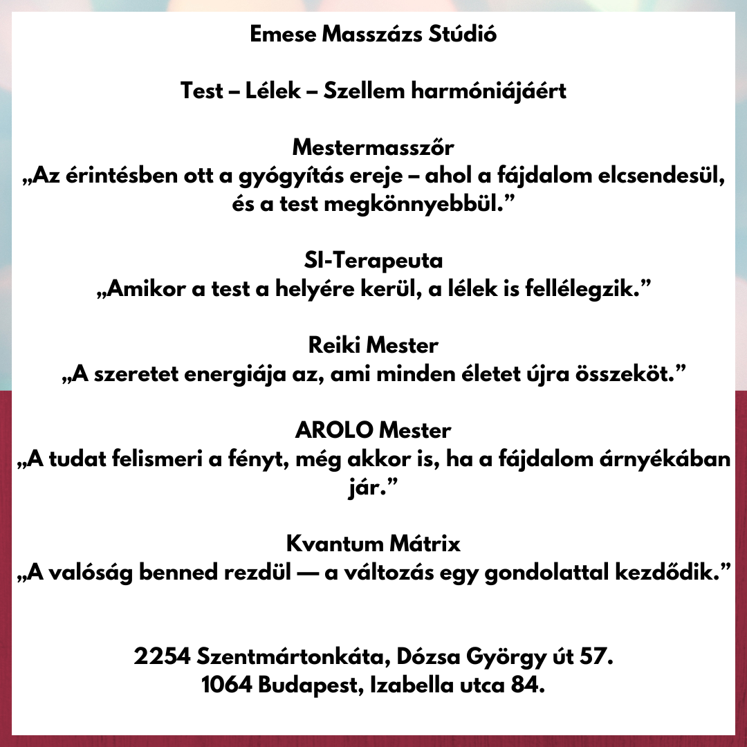 Nekem az a célom és a küldetésem, hogy a gyógyító masszázsok segítségével segítsek az egészségük megőrzésében és gyógyításában!